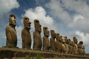 Ces statues de pierre, hautes parfois de 9 metres dont la silhouette est unique au monde, suscite la curiosité des touristes et l’interrogation des scientifiques. Taillés dans la roche d’un des volcans de l’ile, ces statues géantes (jusqu’à 80 tonnes pour les plus grosses) sont placées le dos à la mer sur des plates-formes (ahus) qui leur servent d’estrades.